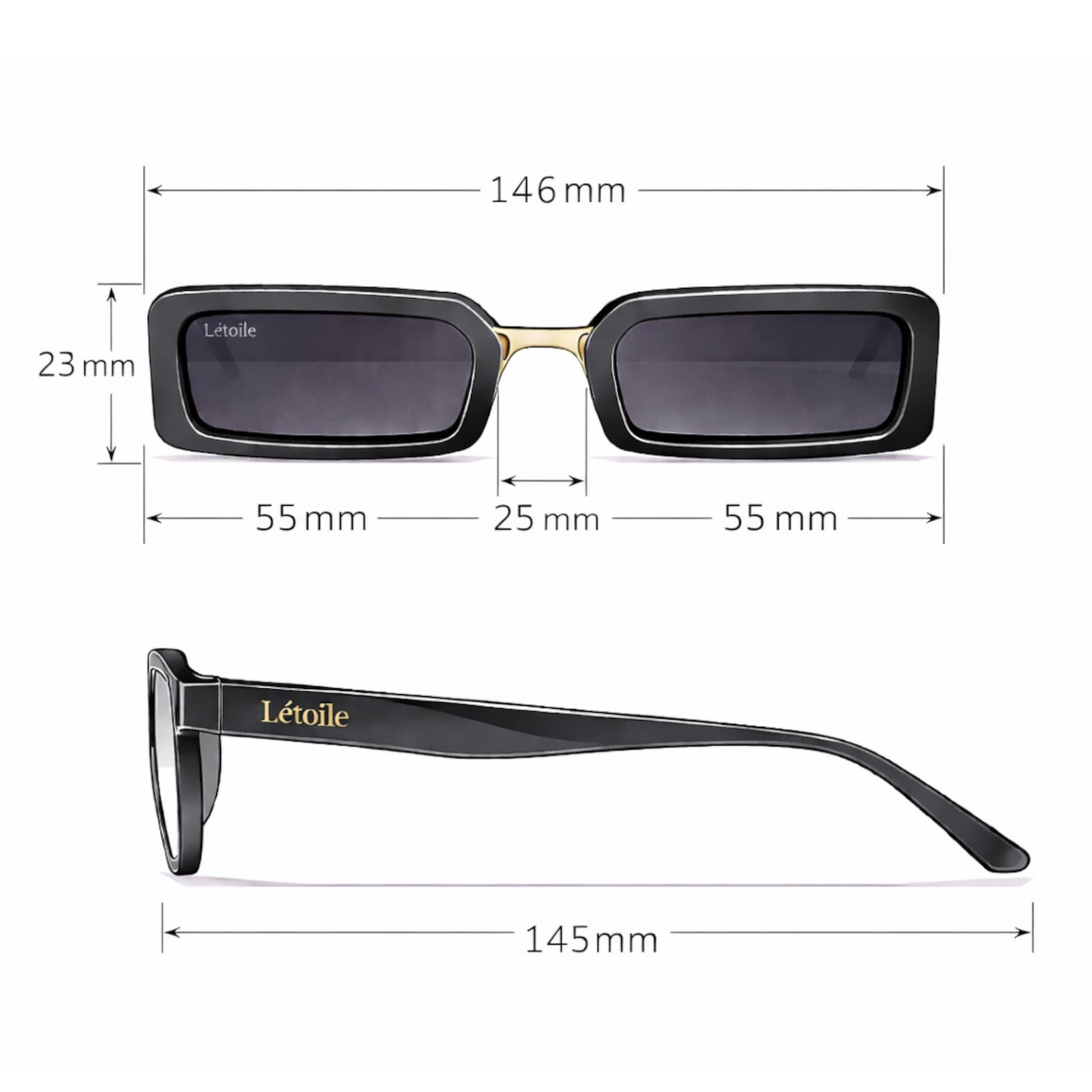 - Maße: Linsenbreite 55mm, Stegbreite 25mm, Linsenhöhe 23mm, Bügellänge 145mm, Gesamtbreite 146mm